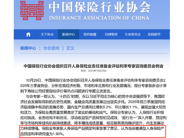 2025-10-31 14:5310月29日,中国保险行业协会组织召开人身保险业责任准备金评估利率专家咨询委员会2025年三季度例会,保险业专家认为当前普通型人身保险产品预定利率研究值为1.90%。