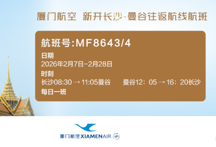 厦航明年2月新开长沙至曼谷、吉隆坡两条国际航线